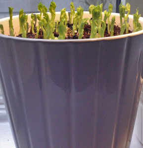 2. Då de börjat gro (brukar ta några dagar) ska de planteras i en kruka med jord.